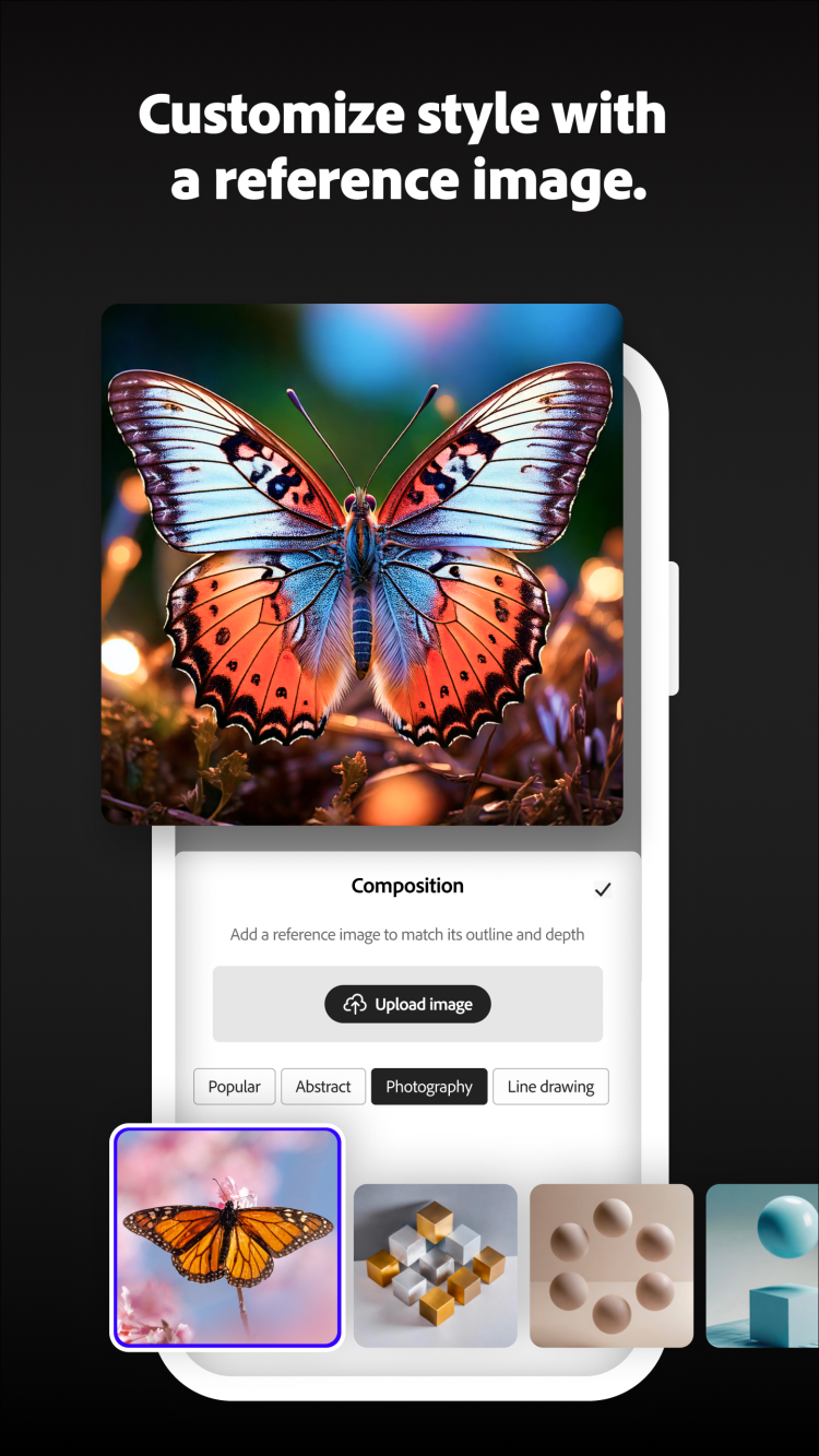 Important, that using Adobe Firefly, you can customize the style of the desired content, adjusting lighting, color options, virtual camera settings, or applying effects. Or, to make things even easier, you can just upload any image in the preferred style, that will be used as an example for content generation. Another important advantage is "Generative Fill" function. It can be used to remove any objects from your images and painting new ones. Every design can be easily adjusted and then exported or shared directly from your smartphone or tablet.