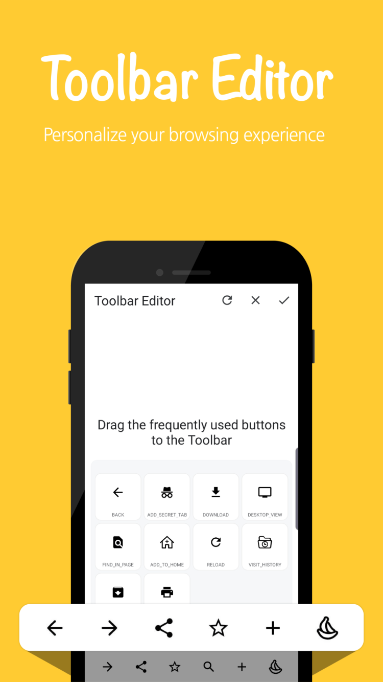 Another advantage of the Banana Browser APK is the customizable toolbar. Users can place frequently used functions to the toolbar at the bottom of the screen and then rearrange the icons, to make the browser's appearance more personalize and make the selected tools more accessible.