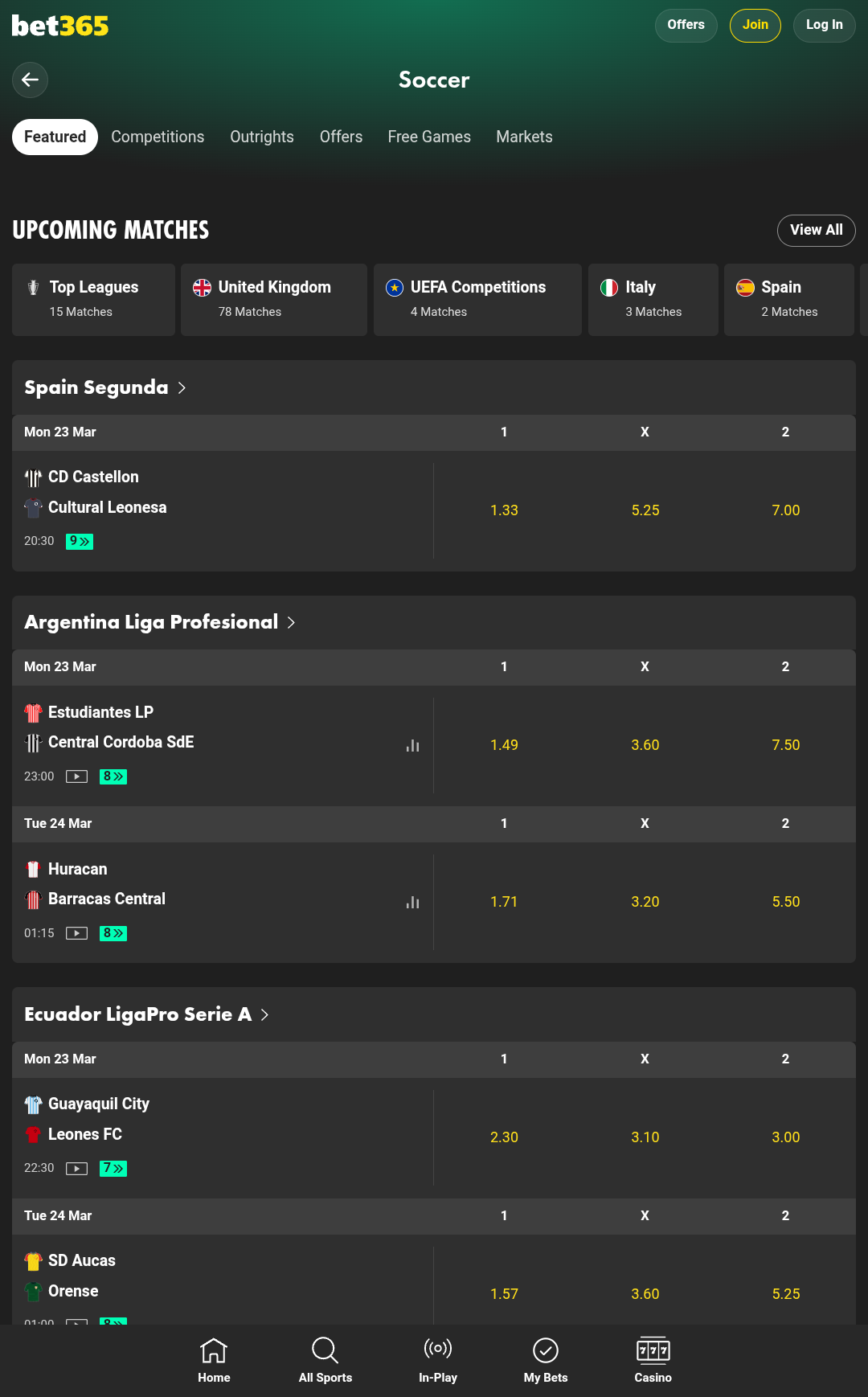 The main section of the bet365 app is dedicated to sports betting, where users can find virtually any popular match across major sporting events. The platform covers over 20 major and niche disciplines, including soccer, basketball, tennis, horse racing, and more exotic options like darts, Gaelic sports, water polo, and American football. The app supports both local and international competitions. In the Top Leagues section, bettors can find the most popular events, including matches from the England Premier League, UEFA Europa League, UEFA Champions League, UEFA Conference League, Spain La Liga, Italy Serie A, Germany Bundesliga, Japan J-League and other leagues from around the world.
