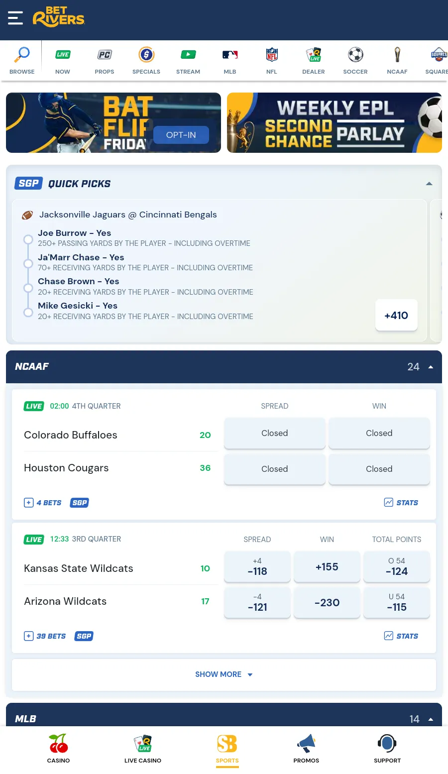 Ongoing promos include 20–50% profit boosts on sports like NFL or NBA, “Bet & Get” offers (e.g., $10 bonus bet for three $10 NBA parlays), and casino promotions like Free Bonus Bingo or Wheel Spins.