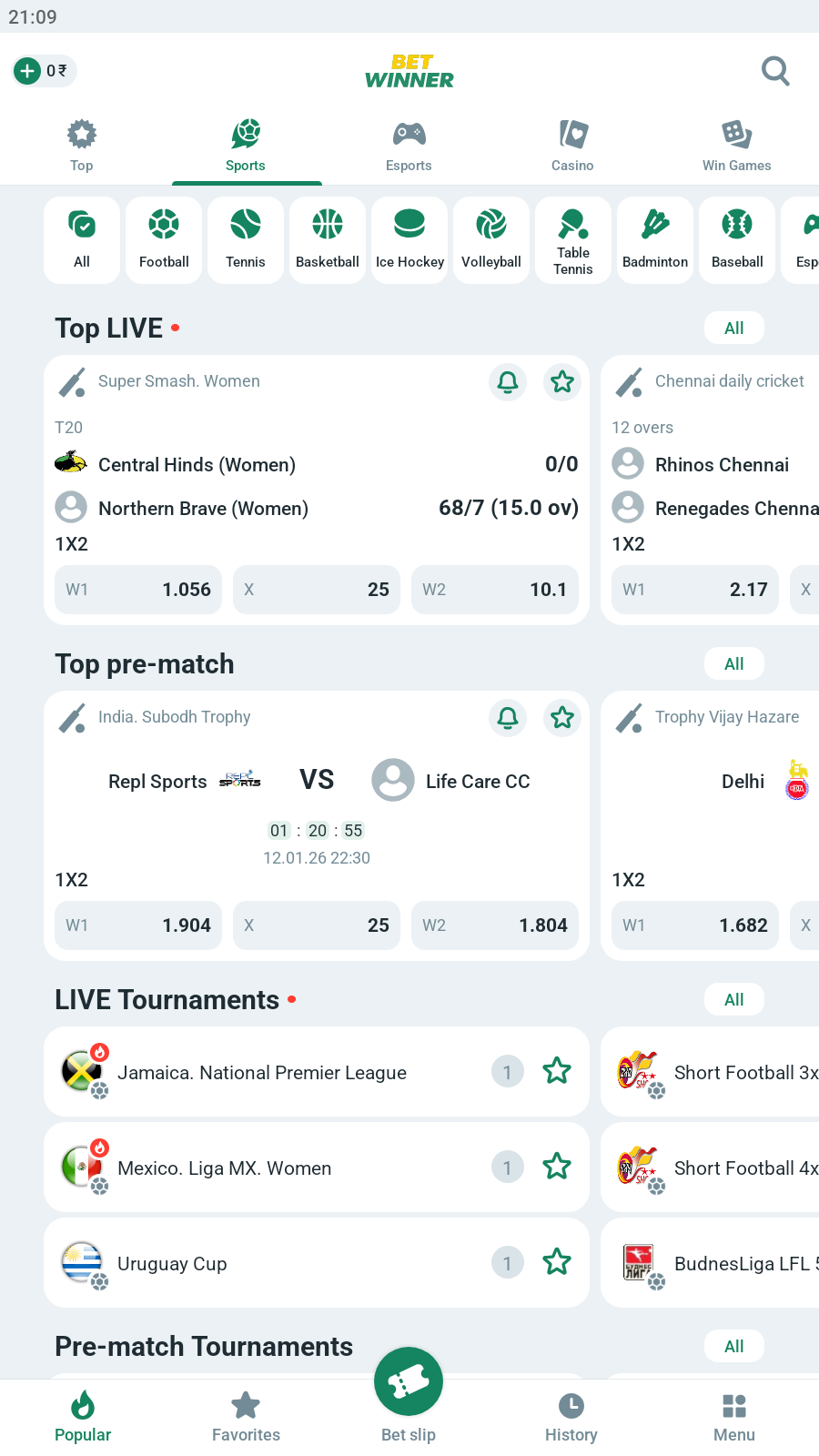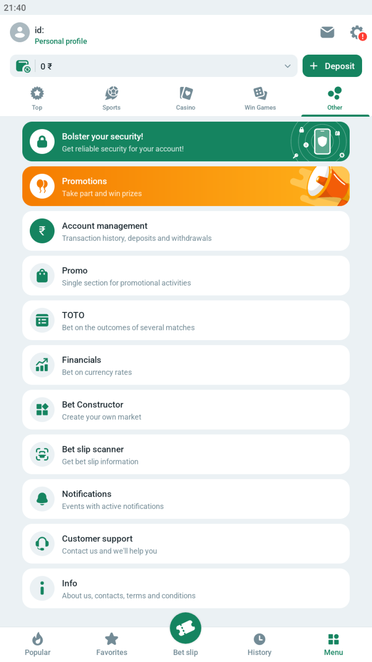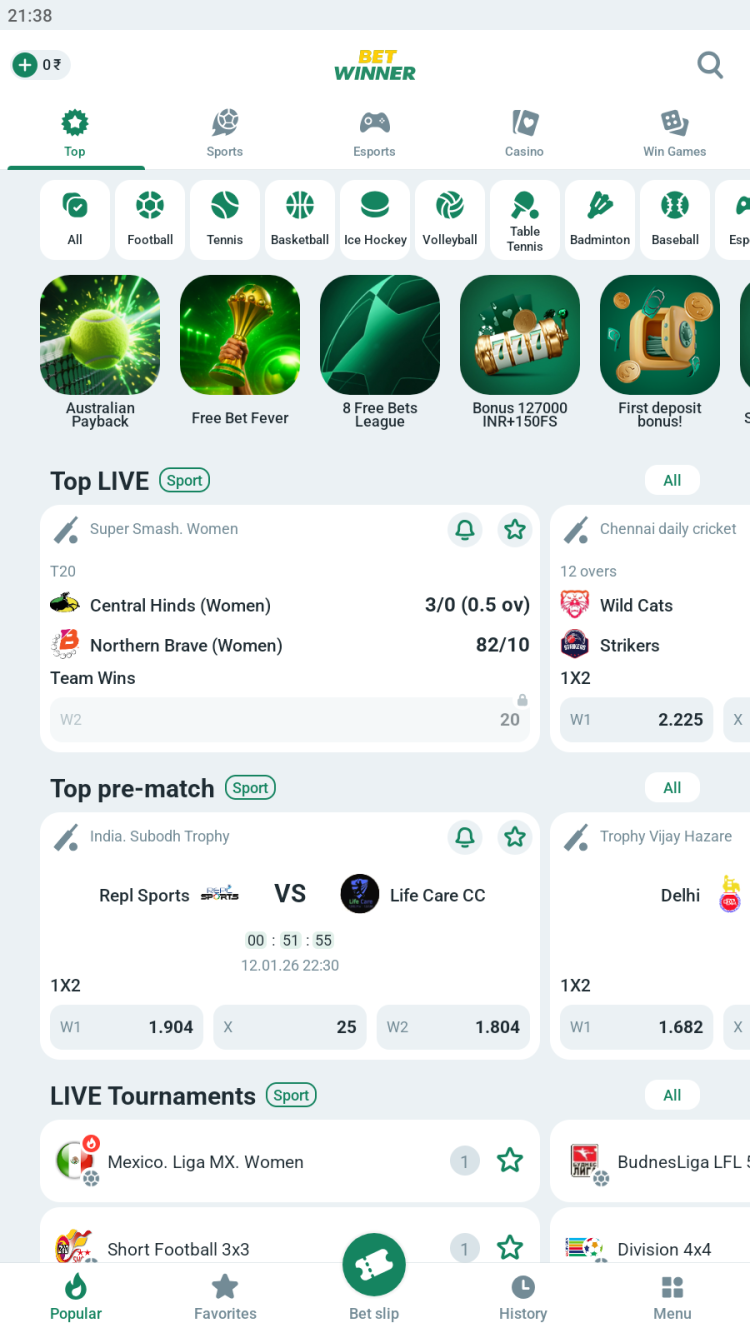 The Android app provides access to all the website features for both betting and entertainment. Users can place bets on more than 30 sports: football, basketball, tennis, baseball, cricket and more, including major leagues such as the NHL, NBA, and La Liga. Popular events are easily accessible through the "Top Games" or "Recommended" sections. Additionally, the app supports betting on weather, politics, and various other events.