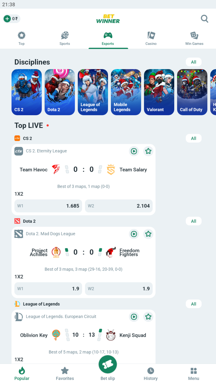 BetWinner also provides the chance to participate in esports betting. Within the official app, users will find several sections dedicated to various types of virtual matches: