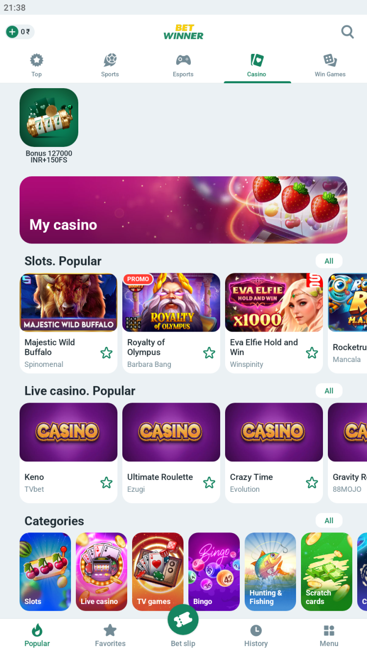 The BetWinner app provides a dedicated section for gambling enthusiasts, showcasing hundreds of slot machines and other games. These games are supplied by both renowned providers and niche studios from around the world, such as Winfinity, EvoPlay, Spinomenal, Evolution, and others. Users can access the following categories of games: