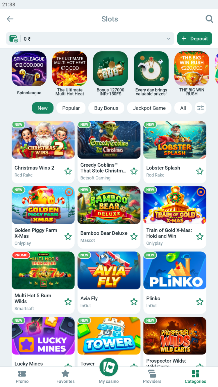 4-th deposit from 1270 INR - 25% bonus and 45 FS, but not more than 38000 INR