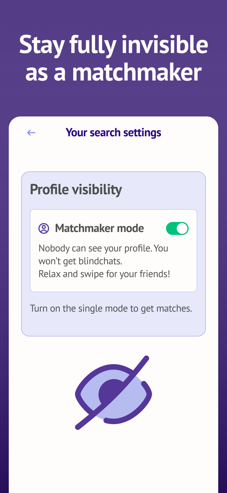 The latest version of Blindmate for Android offers a convenient chat, where singles can get to know each other, without exposing real phone numbers. Special icebreakers can help you start communication effortlessly and naturally, even if speaking with strangers is a big challenge for you. Did your friend find you a suitable partner? Great, now you can return the favor. Users can instantly switch their account roles from singles to matchmakers and vice versa, so friends can always help each other find the best date.