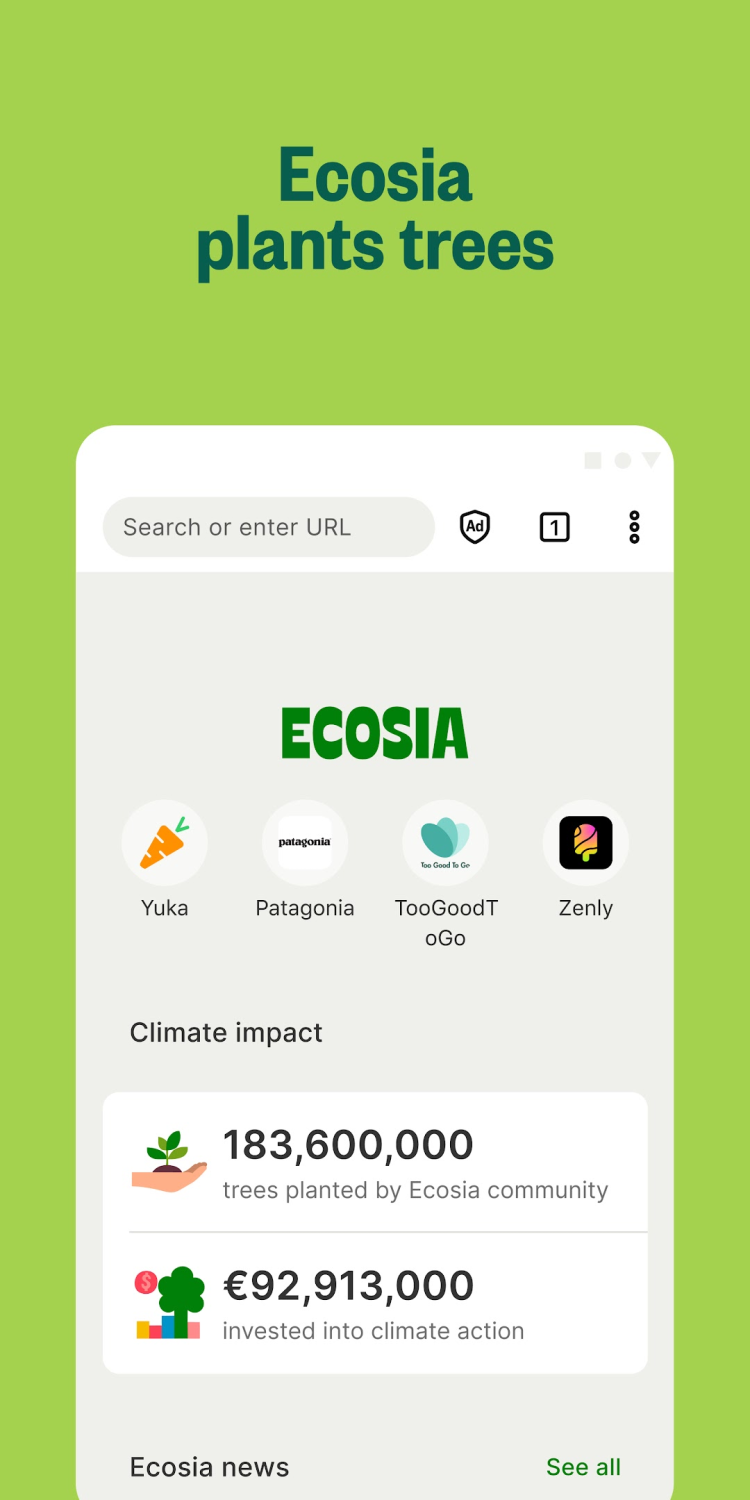 Download the latest version of Ecosia for Android: environment-friendly browser, that helps to tackle climate change, without sacrificing functionality.