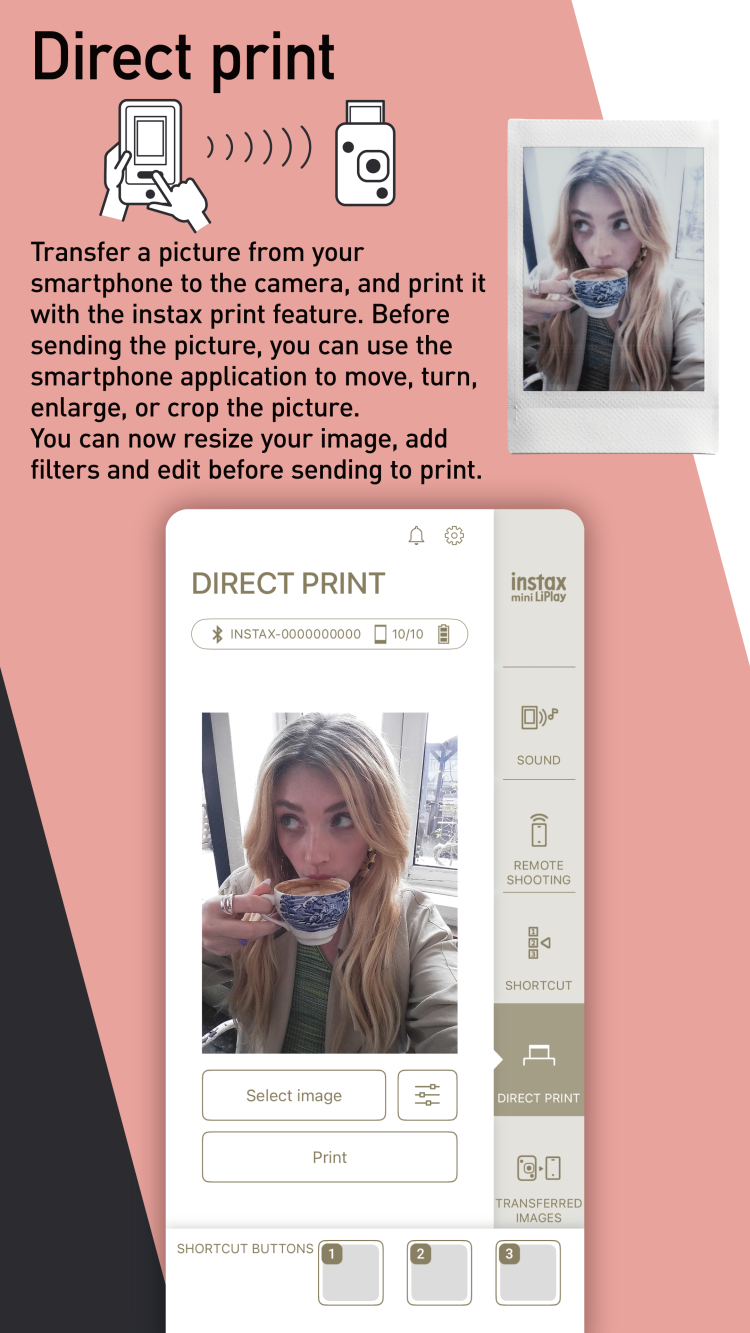 This is an official companion for your instax mini LiPlay hybrid instant camera. It helps you take full advantage of the Fujufilm device's capabilities, that combine a compact camera with an instant portable printer. The biggest advantage of the app is its function to remotely control your LiPlay camera, connecting it to your smartphone via Bluetooth. Frame your shot on your phone's screen, adjust the necessary settings and take the perfect photo, without touching the camera. Captured shots can be instantly sent to print, in a couple of taps.