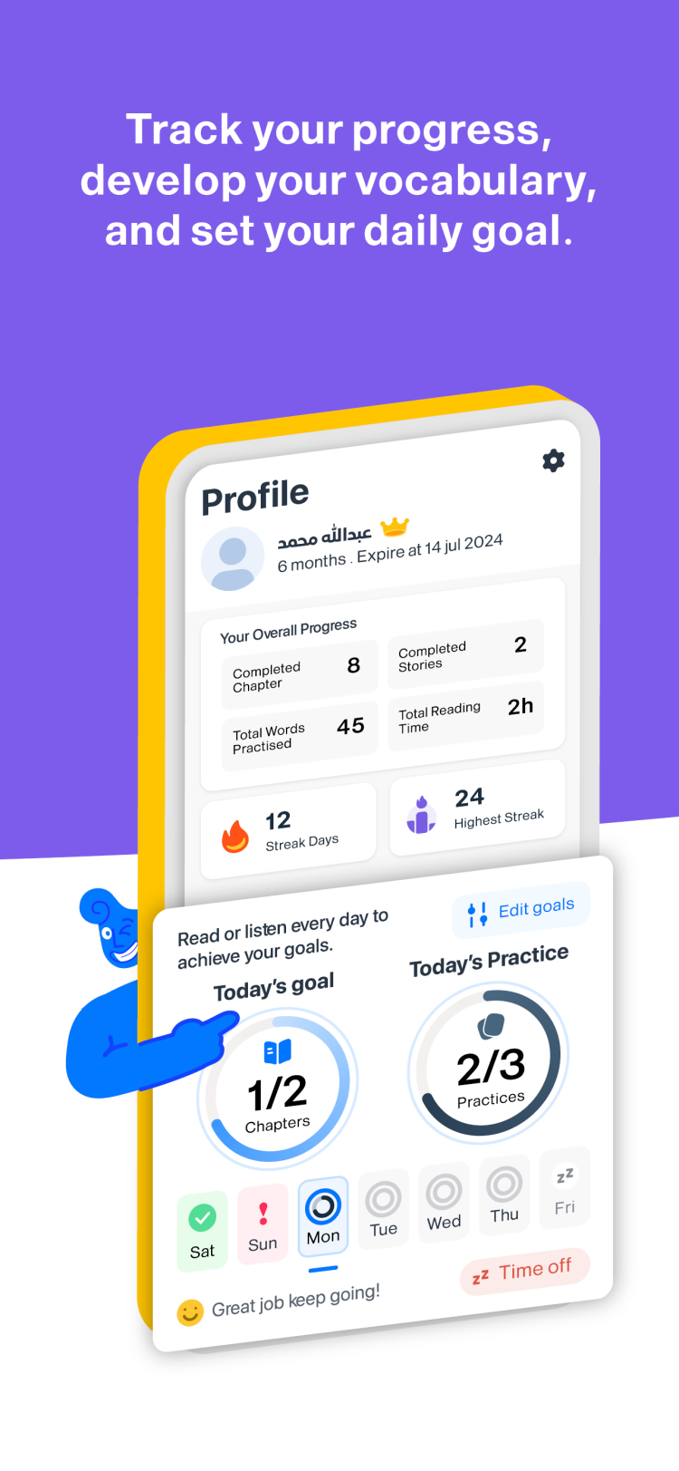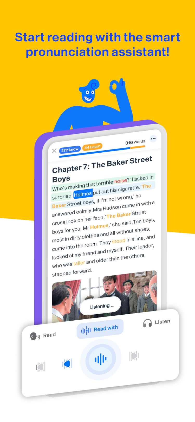 What makes the iStoria app unique is its well-structured approach, that turns your smartphone into a tutor. Each day, you will read a new story in English. You can choose from several options: read the text by your own, read it aloud, so iStoria can correct your pronunciation, or rely on your AI teacher and listen to the story. No matter, which option you choose, you can tap on the unknown words to discover their meaning and listen to correct pronunciation in American and British versions of English.