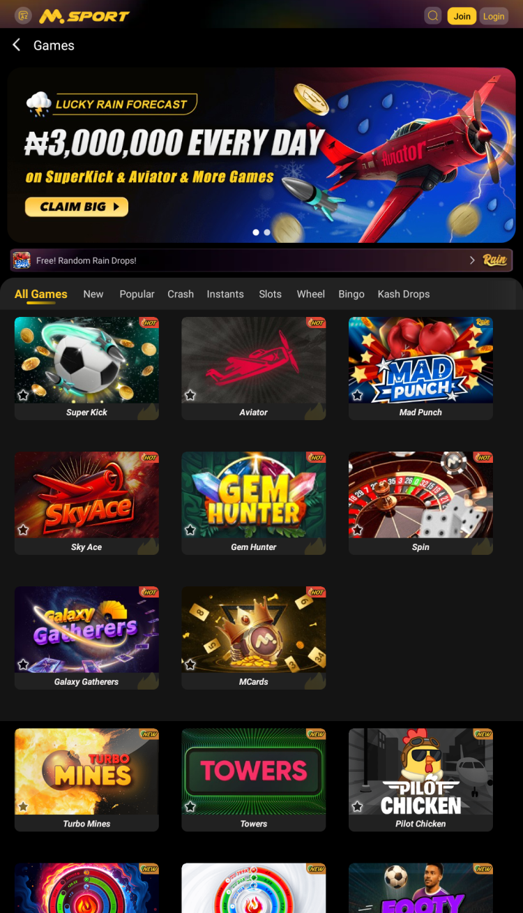 • Lucky Rain Forecast - players can win free bets through two types of rain: Fixed Rain, distributed daily at 6PM (₦1,000,000 in Super Kick) and 10PM (₦500,000 in Mad Punch). Random Rain drops every hour with random amounts, possibly split into several distributions.