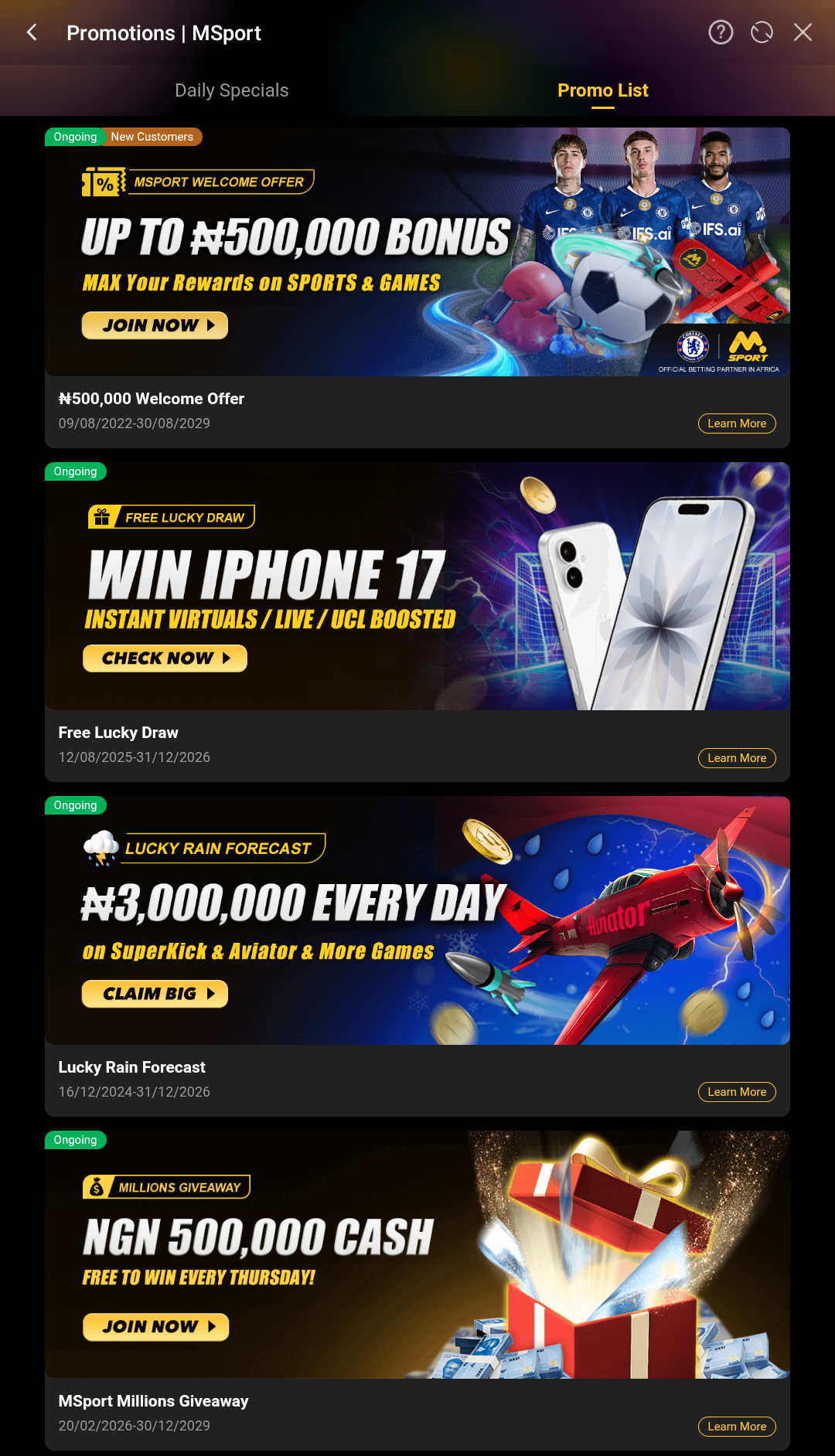• Msports Millions Giveaway - bet on sports or virtual events to receive random "MSport Millions Giveaway" vouchers after your bet settles. Each voucher qualifies you for a NGN 500,000.00 lucky draw held every Thursday at 12pm. Qualifications reset each round.