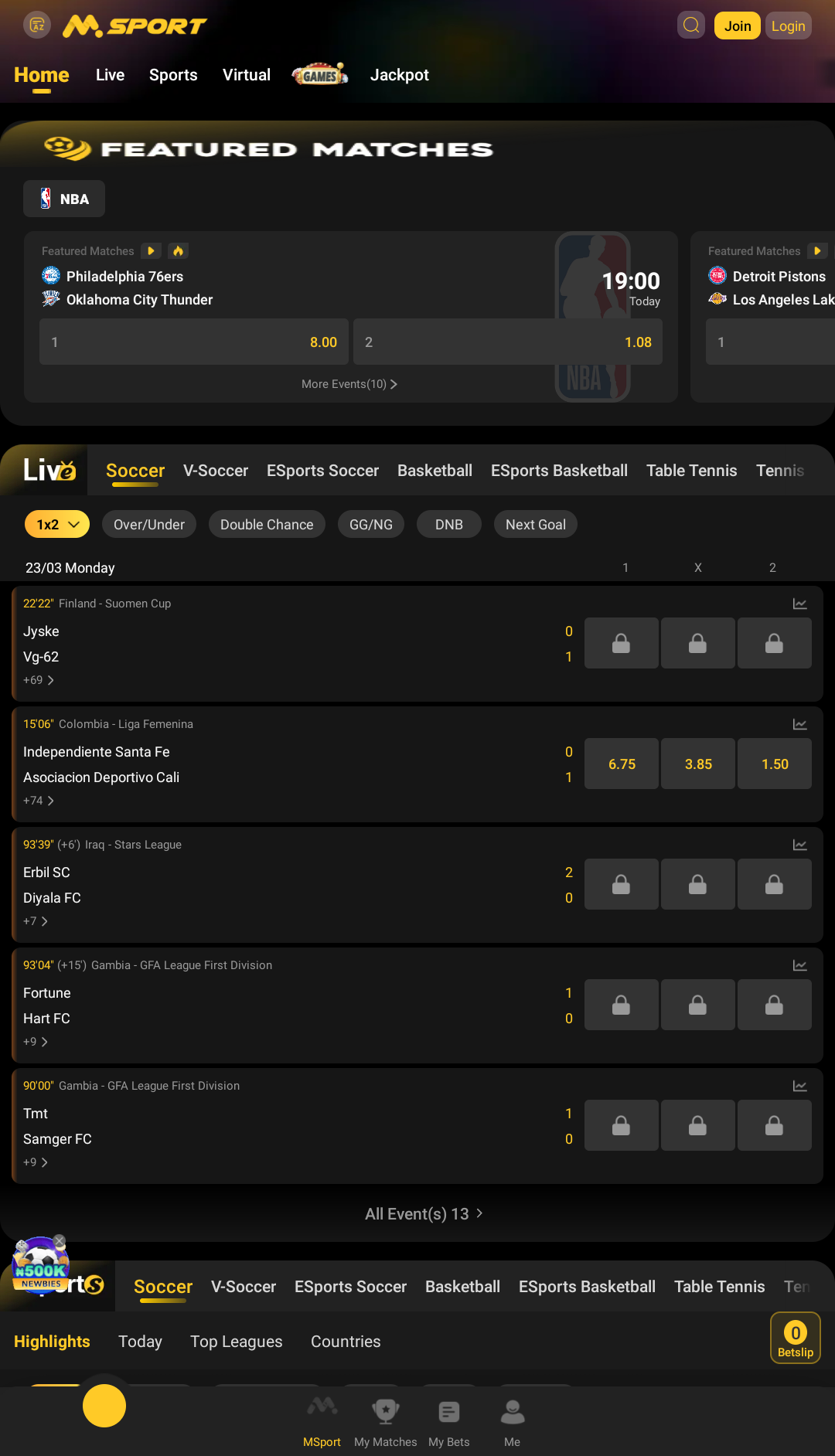 MSport offers a wide selection of sports, including soccer, basketball, tennis, cricket, rugby, boxing, baseball, handball, and more. Both pre-match and live betting options are available. You can bet on major leagues such as the Premier League, La Liga, Serie A, Bundesliga, Ligue 1, UEFA competitions, the NBA, and other global sports events.