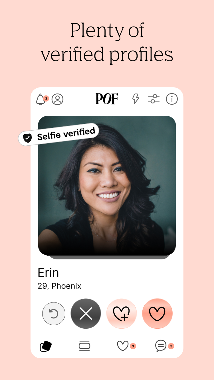 as well as much more. But first of all, you are required to specify, what kind of relationships do you want. It can be serious long-term relationship or just friendship, if you feel lonely. This helps a special matching algorithm to find the perfect singles in your area or connect you with your future BFF. Found the best match? Then say hi, using the built-in messenger and get to know each other better. Please note: the Plenty of Fish, or POF, app is free to download and use, but some functions are only available for premium users.