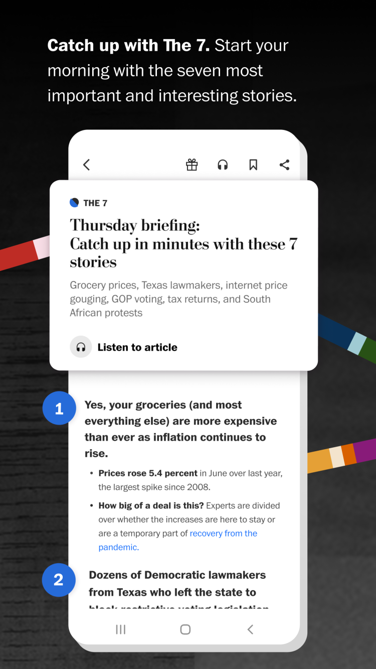 One of the main features of The Washington Post APK is the section "The 7". It will help you start each morning by reading the 7 most important articles. And to free your hands for your morning coffee, you can always use the function of reading articles aloud.