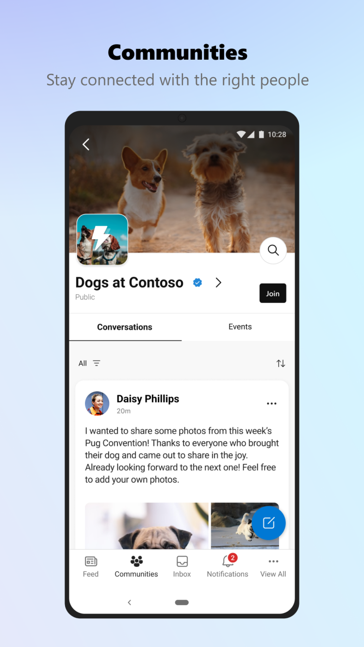 Viva Engage is a mobile application that helps to share news and experience with colleagues and comfortably discuss joint projects online. The program works like traditional social networks. Create an account using your work email address to be able to join communities of interest and connect with colleagues. However, instead of groups dedicated to kitties, music, or other entertaining content, here you'll find corporate communities that bring together employees from your entire organization. Here everyone can share their thoughts and participate in project discussions, trainings, etc. Thus, Viva Engage helps to share experience and coordinate actions when working together on projects, even if you are in different parts of the world.
